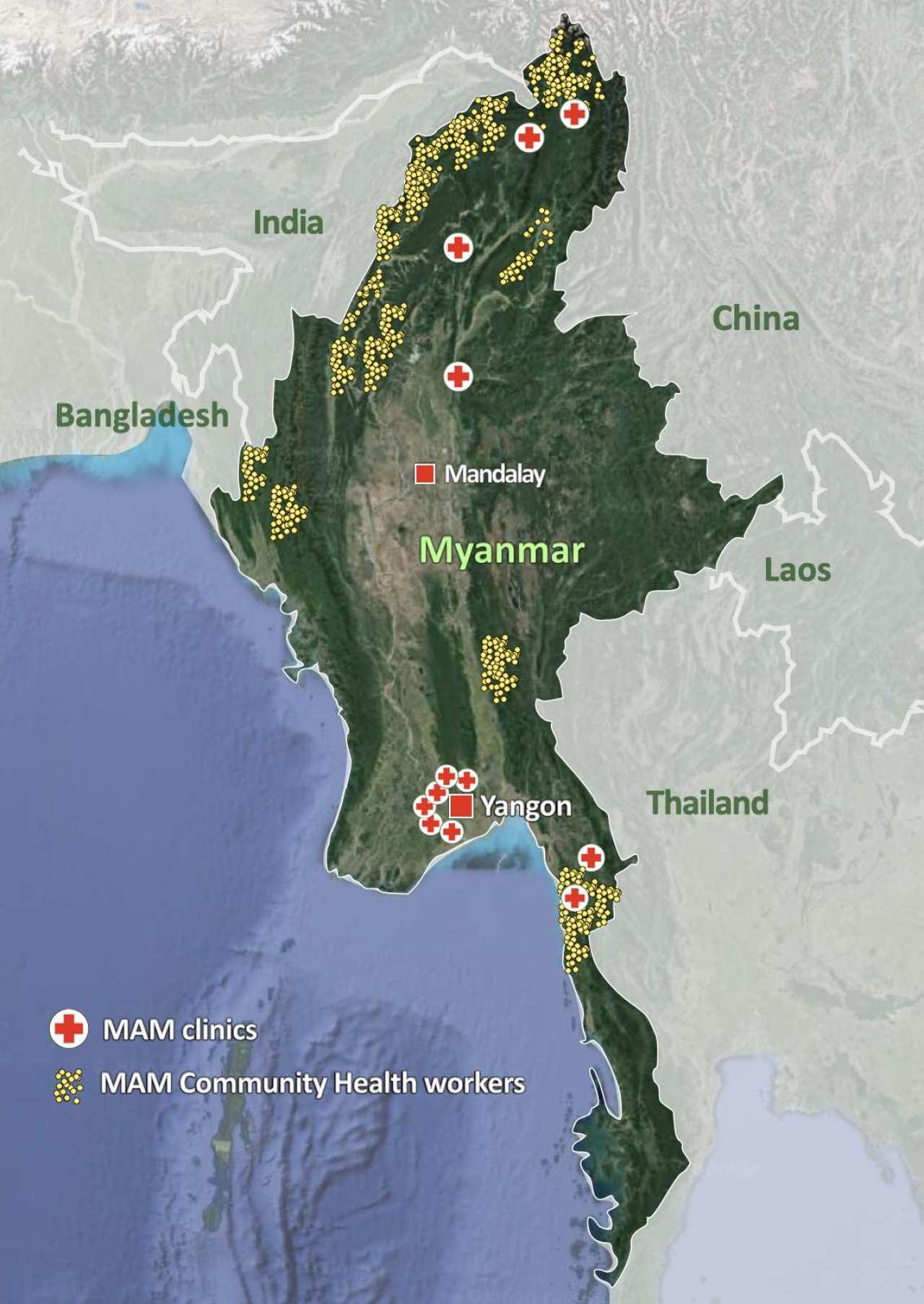 In 2009 MAM started in 1 clinic in Hlaingthayar, a peri-urban slum area of Yangon. Since then we expanded to 12 clinics across Myanmar providing a wide range of medical services for patients with HIV, TB, Hepatitis, Reproductive Tract Infections and Malnutrition, integrated in Basic Health Care services.